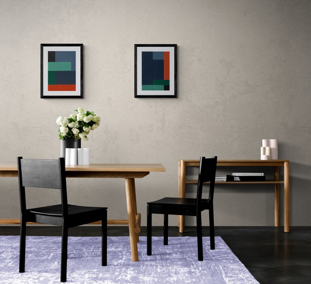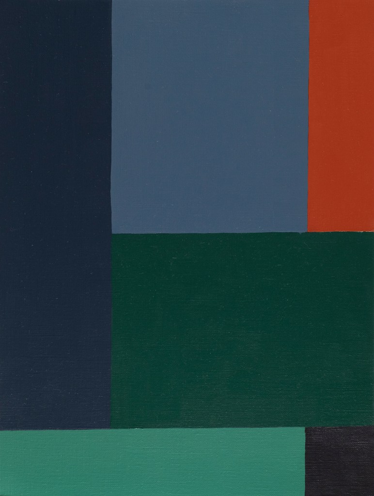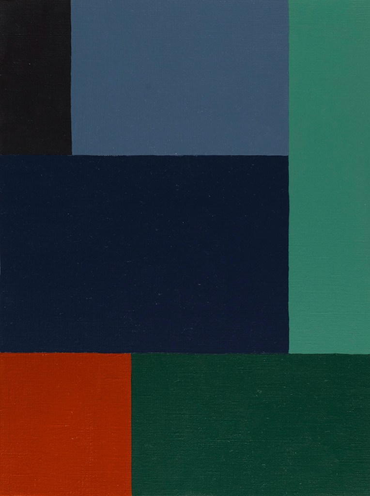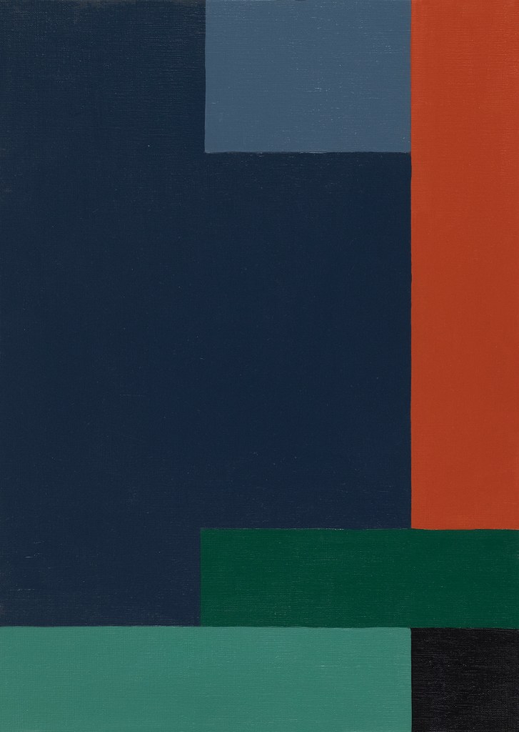Studying the idiosyncrasies of the colour palette used on Felix Vallotton’s famous painting “The Visit” (1899), Bakas chooses to reduce the underlying tension to an orderly assembly of shapes and thoughtfully mixed families of blue. He uses the integrity of his painted building blocks to interpret the inner thoughts and desire built in to humans.